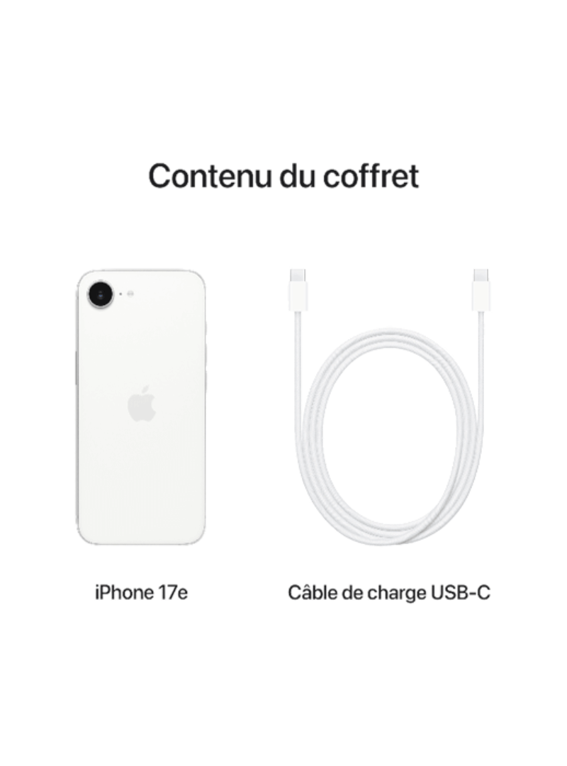 L'iPhone 17e est fourni avec un câble USB-C. Un chargeur compatible USB-C est nécessaire pour pouvoir le charger. Avec cet adaptateur d'origine Apple d'une puissance de 20W, vous pourrez recharger rapidement votre nouvel iPhone.
